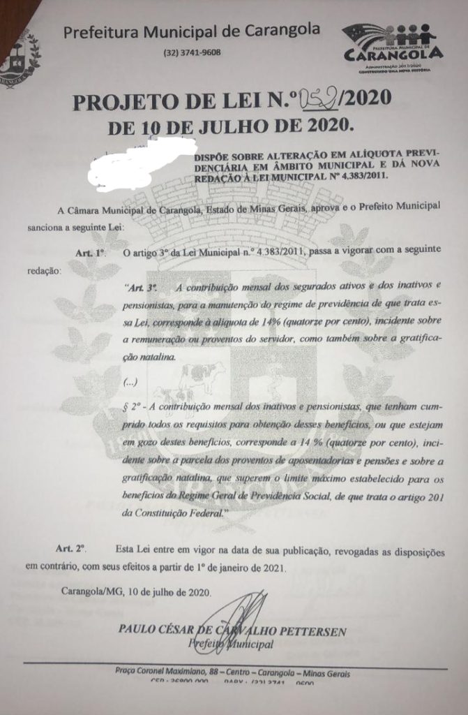 O Carangola Notícias apurou que a Prefeitura de Carangola protocolou os projetos de Lei 052/2020 e 053/2020 na Câmara Municipal de Carangola em 14/07/2020, cerca de 78 dias antes do prazo final para a readequação previdenciária, que é 30/09. Tais projetos alteram a alíquota de contribuição dos funcionários públicos do município de Carangola para 14%, além de readequarem requisitos para aposentaria, aumentando o tempo de serviço e contribuição.