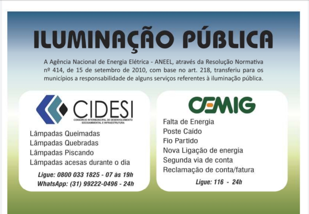 Em Carangola, as comunicações de defeitos em lâmpadas da iluminação pública devem ser direcionadas ao CIDESI, através do telefone 0800 033 1825 ou enviando mensagens via WhatsApp 31 9 92220496. Todos estes atendimentos funcionando 24 horas.