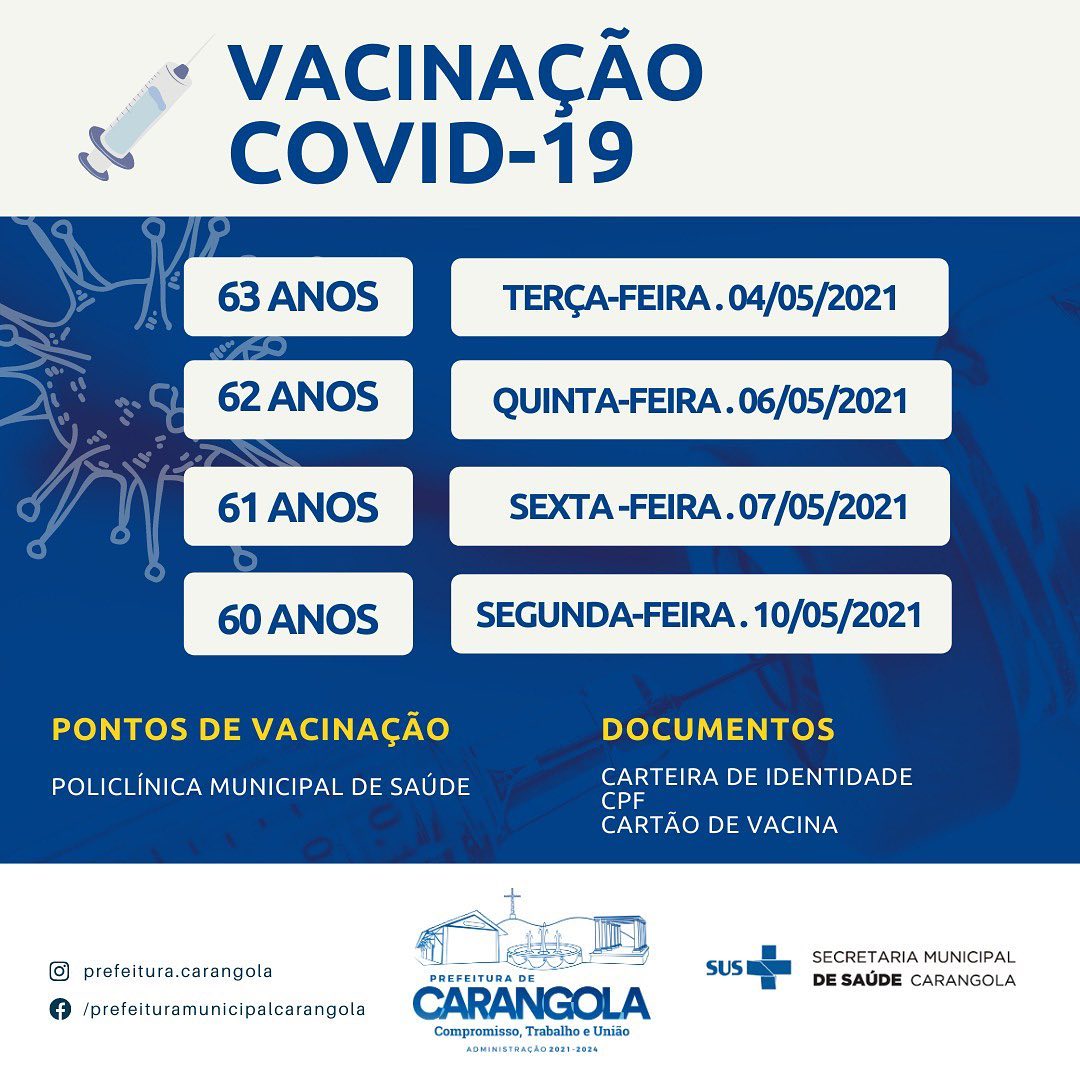 VACINAÇÃO EM CARANGOLA SE ESTENDERÁ AOS GRUPOS DE 60 A 63 ANOS; CLIQUE E CONFIRA AS DATAS POR IDADE