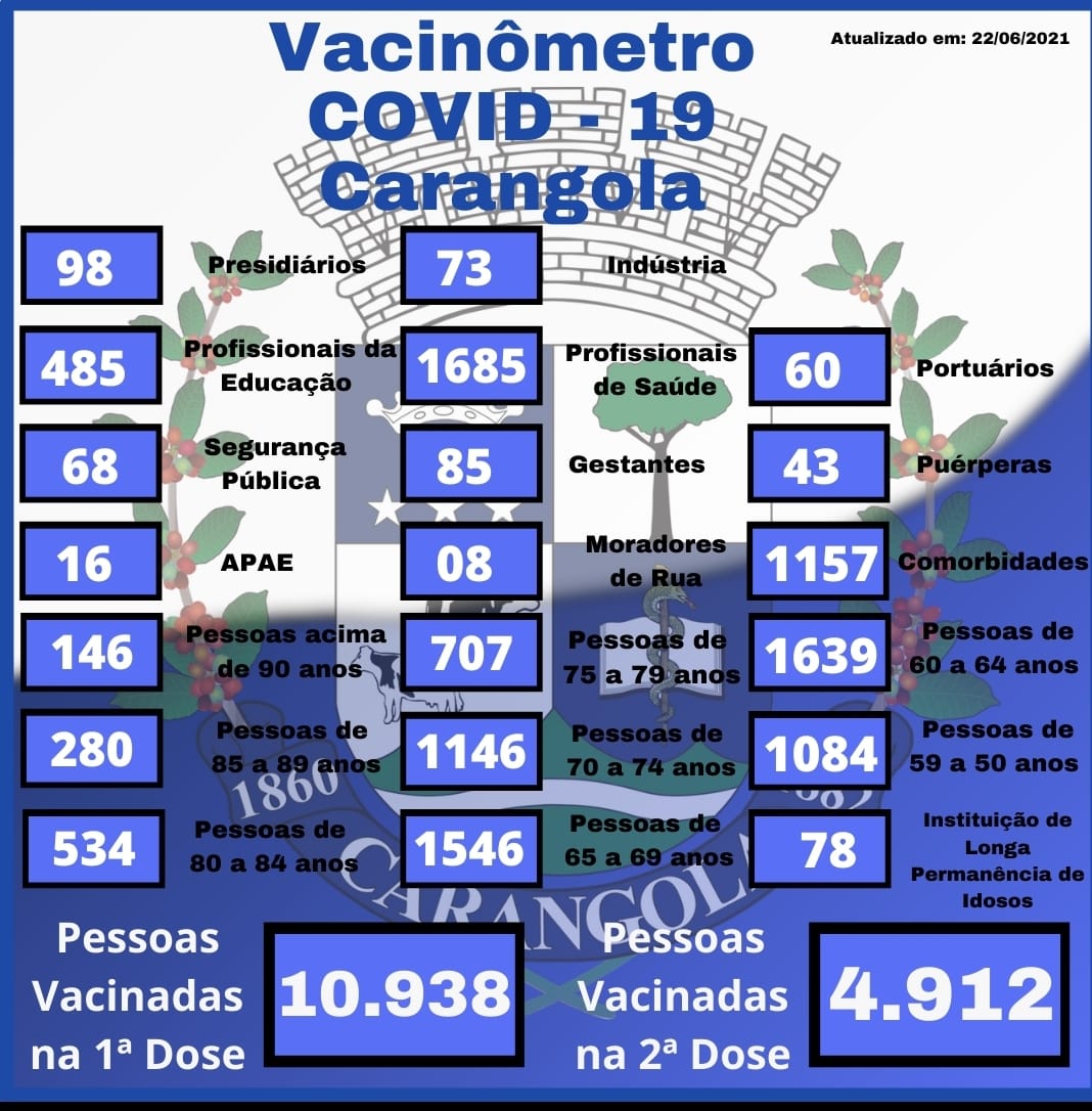 Com a população estimada em aproximadamente 33.000 habitantes, o município de Carangola anuncia que já vacinou a primeira dose da vacina contra a covid-19 em 10.938 pessoas, o que representa cerca de 1/3 da população vacinada na primeira etapa da imunização. Vale ressaltar a GRANDE IMPORTÂNCIA EM TOMAR A SEGUNDA DOSE DA VACINA NA DATA INDICADA PELOS PROFISSIONAIS DA SAÚDE!!!