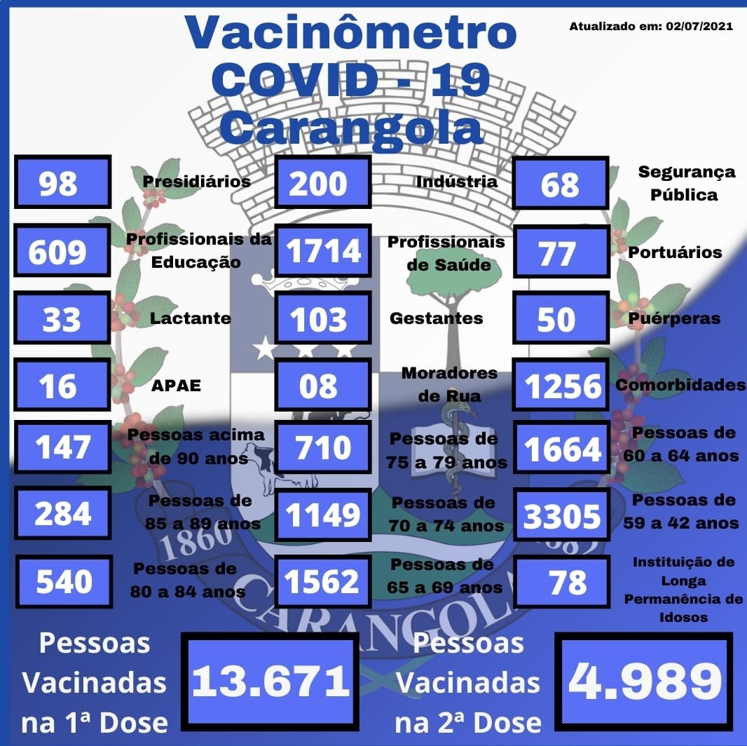 VACINÔMETRO MOSTRA QUE MAIS DE 40% DA POPULAÇÃO DE CARANGOLA JÁ VACINOU CONTRA A COVID-19 PELO MENOS COM A 1ª DOSE